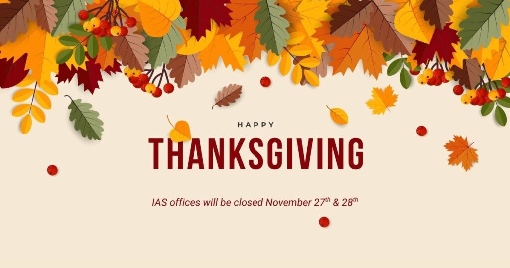In observance of Thanksgiving, the IAS office in Brea, California is closed Thursday, November 27th and Friday, November 28th, 2025. IAS will re-open on Monday, December 1st.