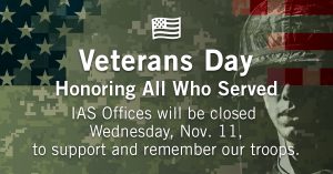 The IAS offices will be closed Wednesday, November 11, for Veterans Day. Thank you to all those who have served, and those who continue to serve. Happy Veterans Day!